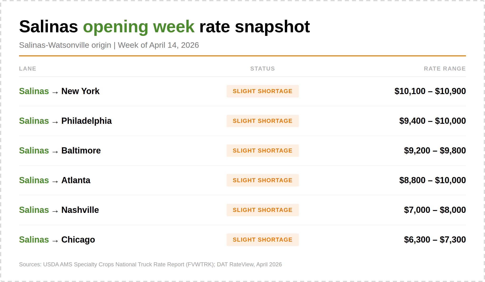 Salinas opened short on trucks across every reported commodity: broccoli, cauliflower, lettuce, strawberries, and more [1]. East Coast lanes are already commanding $9,200 to $10,900 per load. Atlanta is $8,800 to $10,000. Nashville is $7,000 to $8,000. Chicago is $6,300 to $7,300.